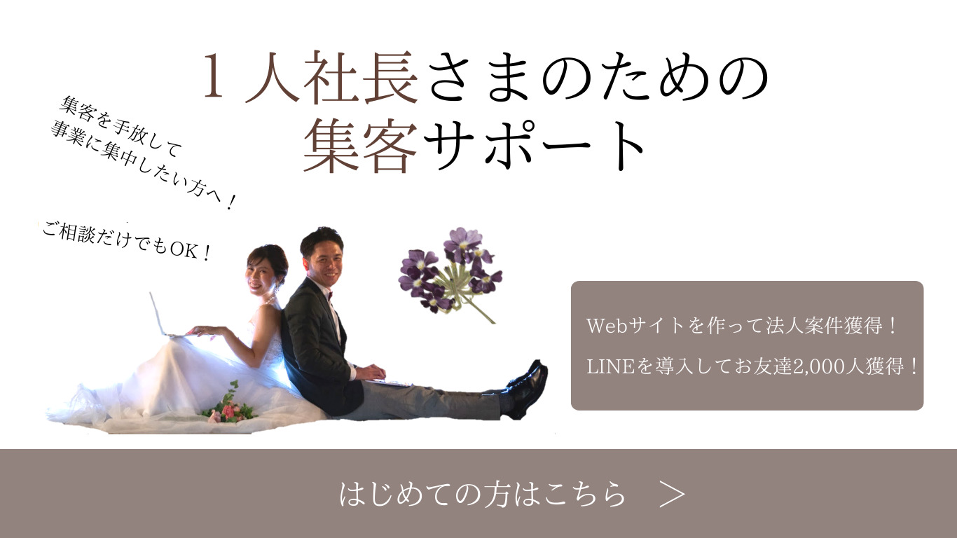 1人で戦っている「社長」に寄り添う。 個人事業主や1人社長として孤軍奮闘している社長様。 プライベートも仕事も大忙しだけど、課題が山積み。 人手が欲しいけど、なかなかいい人材に出会えない。 その問題、あきらめないでください! そんな社長様のお声に、私たち夫婦が応えます。 家族のような温かさと、社員のような強い絆で。 見失いがちな事業の目的を引き出し、そこに一直線に向かえるように 共に戦略を練り、ベストな道を伴走します。 夫婦だからできるサポートを、ぜひ体験してみてください。